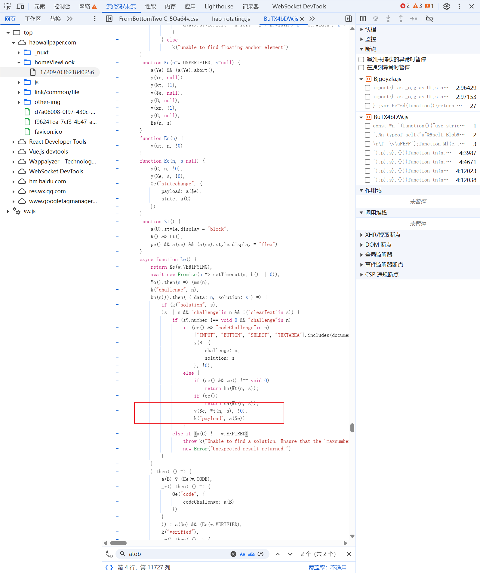 到这里已经知道是根据前面的返回值 做了一定的操作之后得到的这个pylaod,关于前端加密一般都是用到base64、hash、aes、des、rsa算法操作处理,所以一般直接点进去下图圈中的搜这类关键字能在js代码里找到加密逻辑