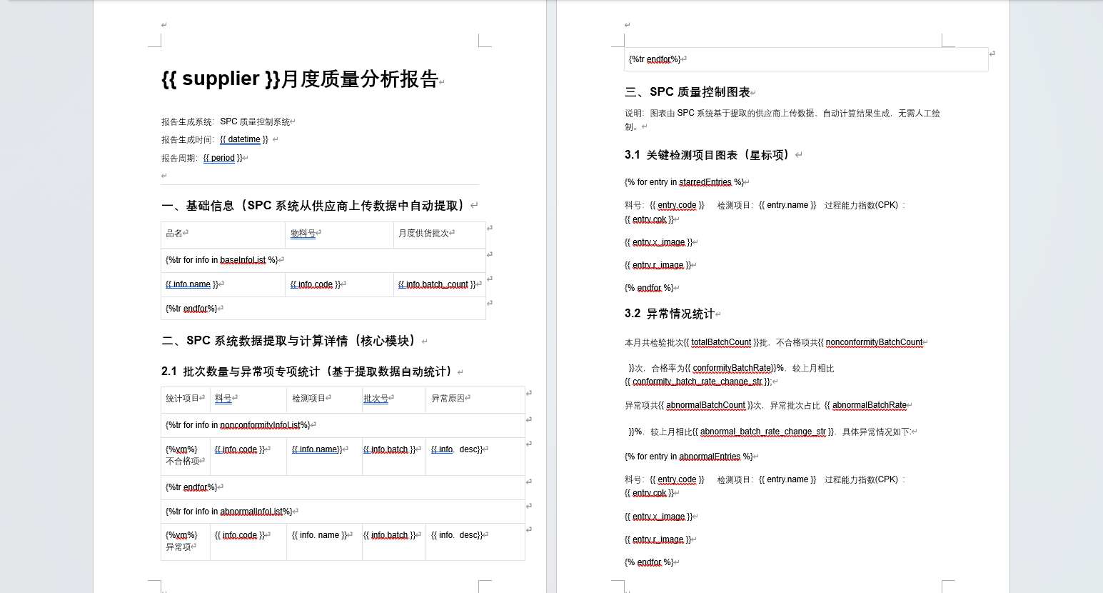 InlineImage,便于把 SPC 图表图片插入文档模板。模板更接近业务文档本身,后续如果报告版式调整,维护成本比纯代码拼装更低。
