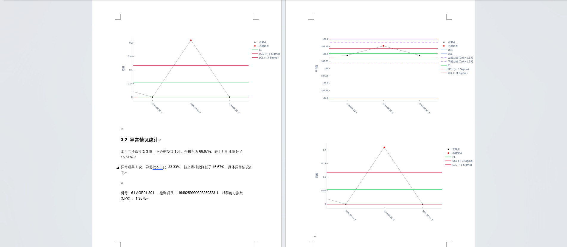 项目中存在一类周期性输出需求:按月对 IQC 报告进行汇总分析,并按供应商生成一份可分发、可归档的质量分析报告。报告内容不仅包含基础统计信息,还包括 SPC 图表、异常批次、不合格批次以及重点条目的趋势图,因此这项能力本质上是一个“定时调度 + 数据聚合 + 图表渲染 + 报告输出”的组合流程。