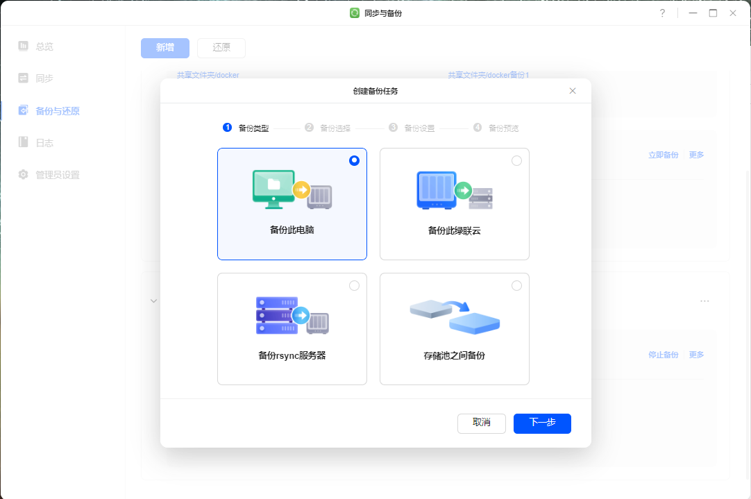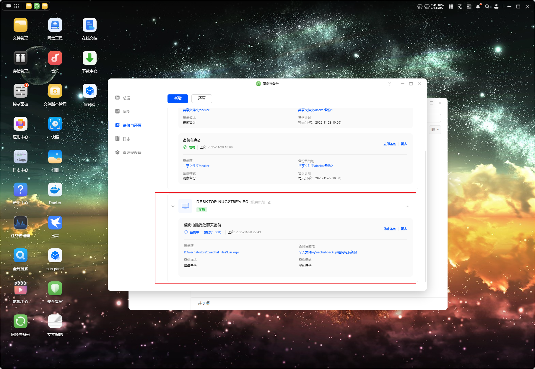 4.nas新建备份任务,关联nas和本地电脑的路径,然后设置手动或者自动备份(这里的备份没有定时任务,微信聊天记录隔一段时间自己手动备份即可)