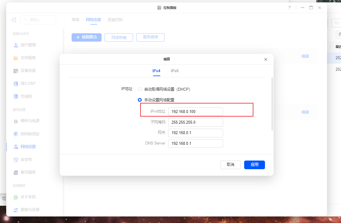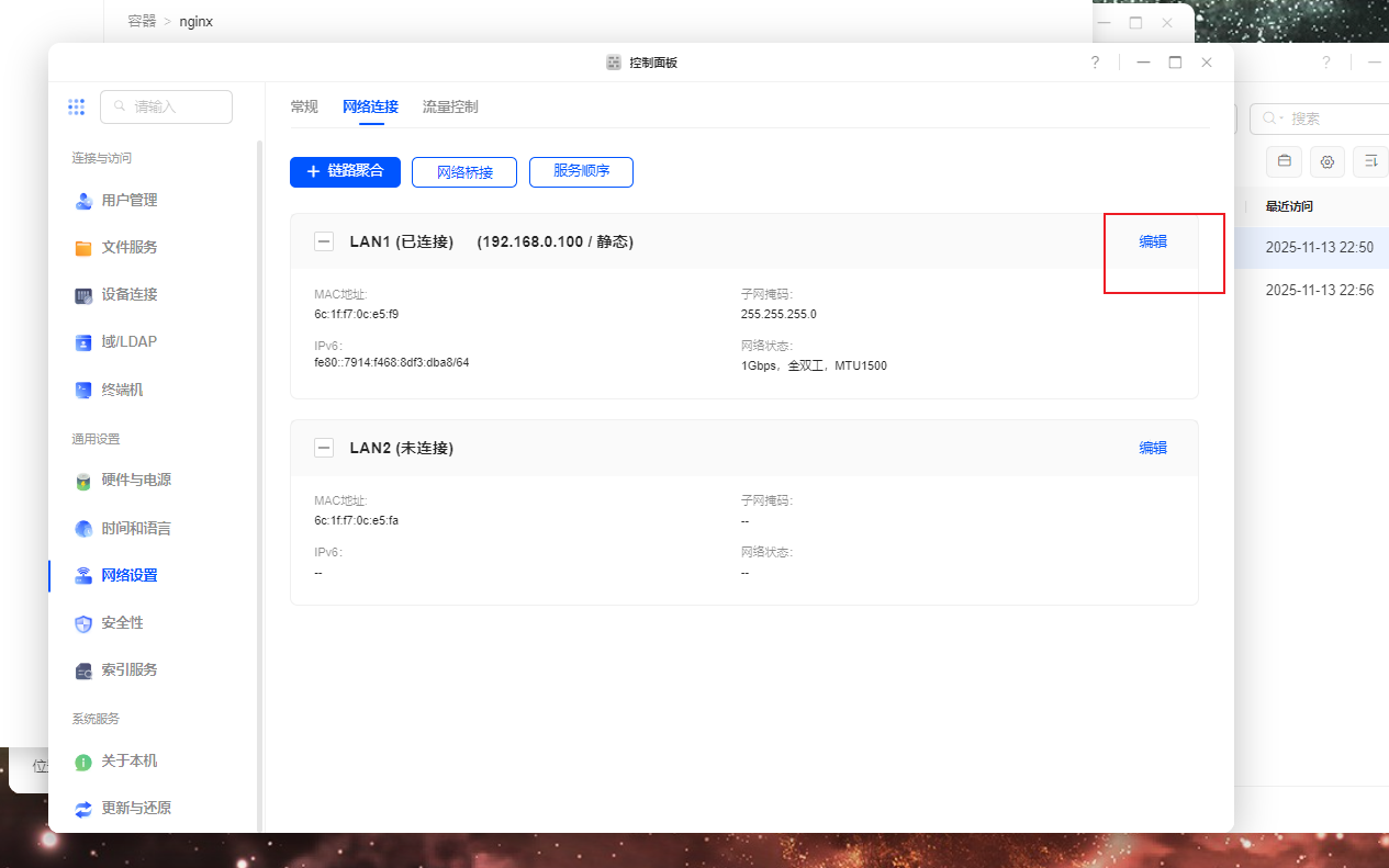 在此之前最好固定下nas的局域网ip,不然断电重启ip改变了会造成一些麻烦,如下操作
