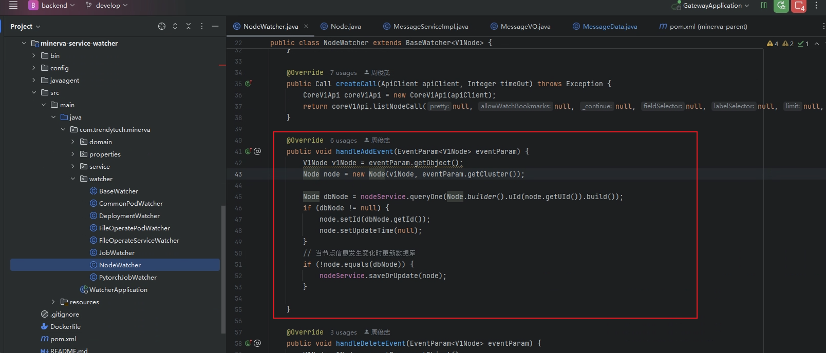 在watcher模块的NodeWatcher类中修改handleAddEvent方法,监听node信息变化判断gpu的状态是否变为failed或者success,是的话就保存一条站内信到message表中