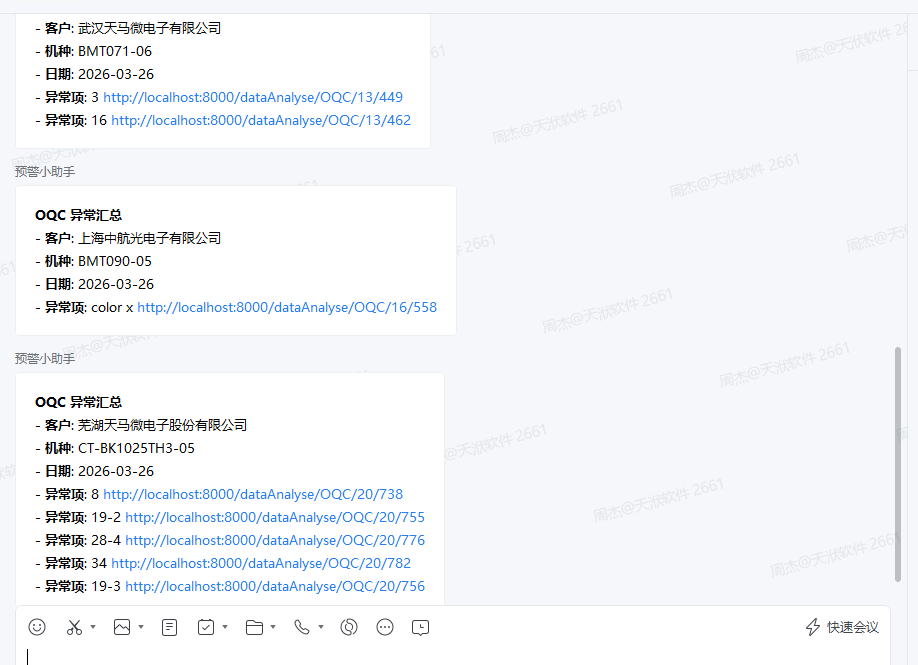 为了实时监控企业SPC流程链路的异常情况(如 CPK 不达标或检测值超限),系统集成了企业微信 Webhook 推送功能。当 OQC 或 IQC 报告在导入或计算后出现“异常”状态时,会自动向指定的企业微信群发送 Markdown 格式的预警消息,并提供直接跳转至前端详情页的链接,实现“发现即通知,通知即处理”的闭环。