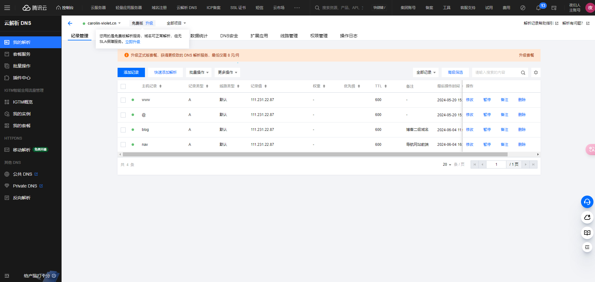 先在腾讯云域名解析配置二级域名解析如下,配置nav的二级域名