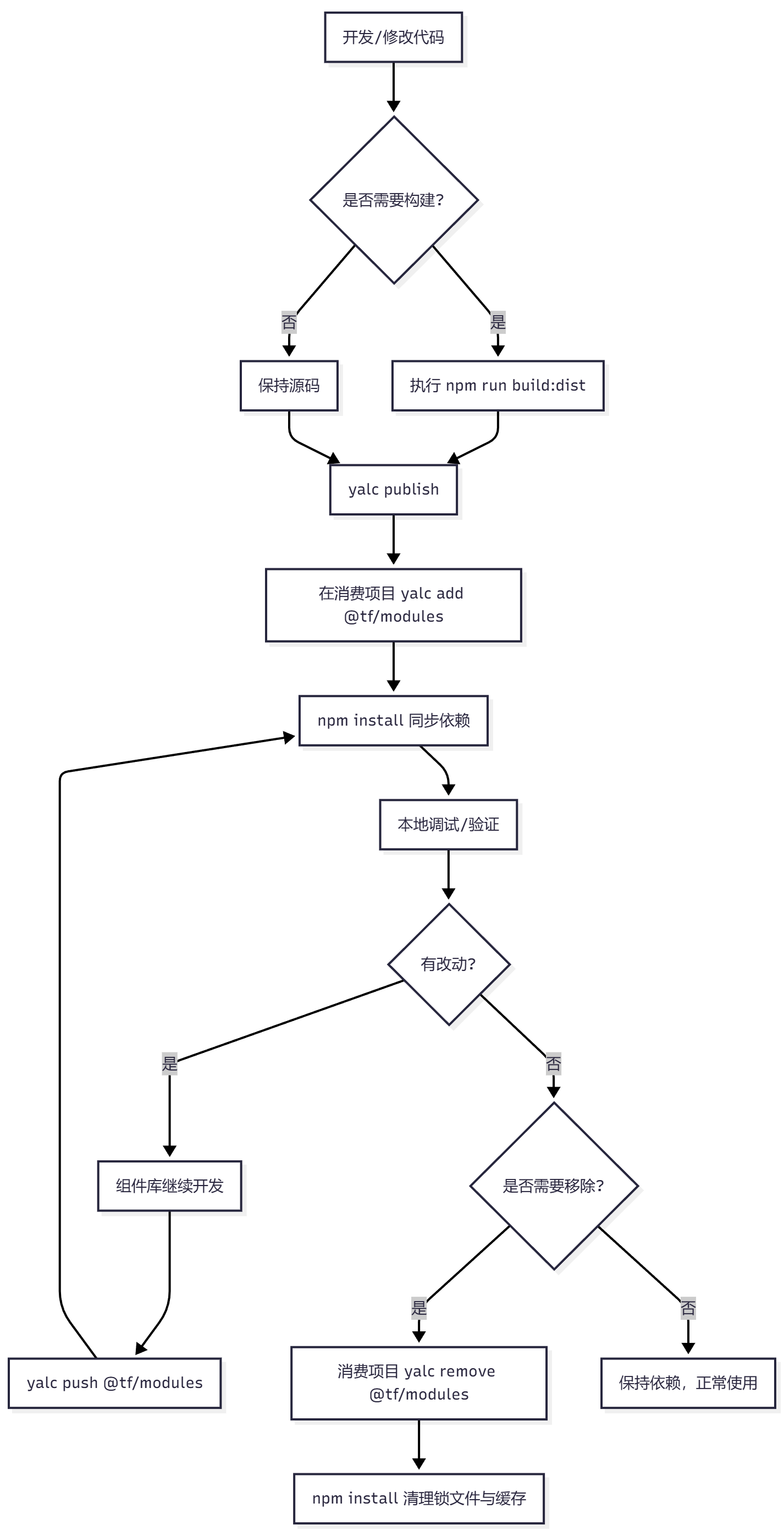 yalc push @tf/modules→ 消费项目自动更新依赖验收/回退:验证功能 → 不再需要时,消费项目