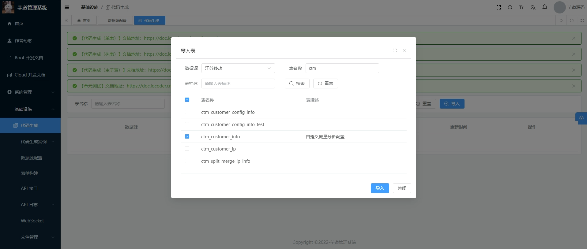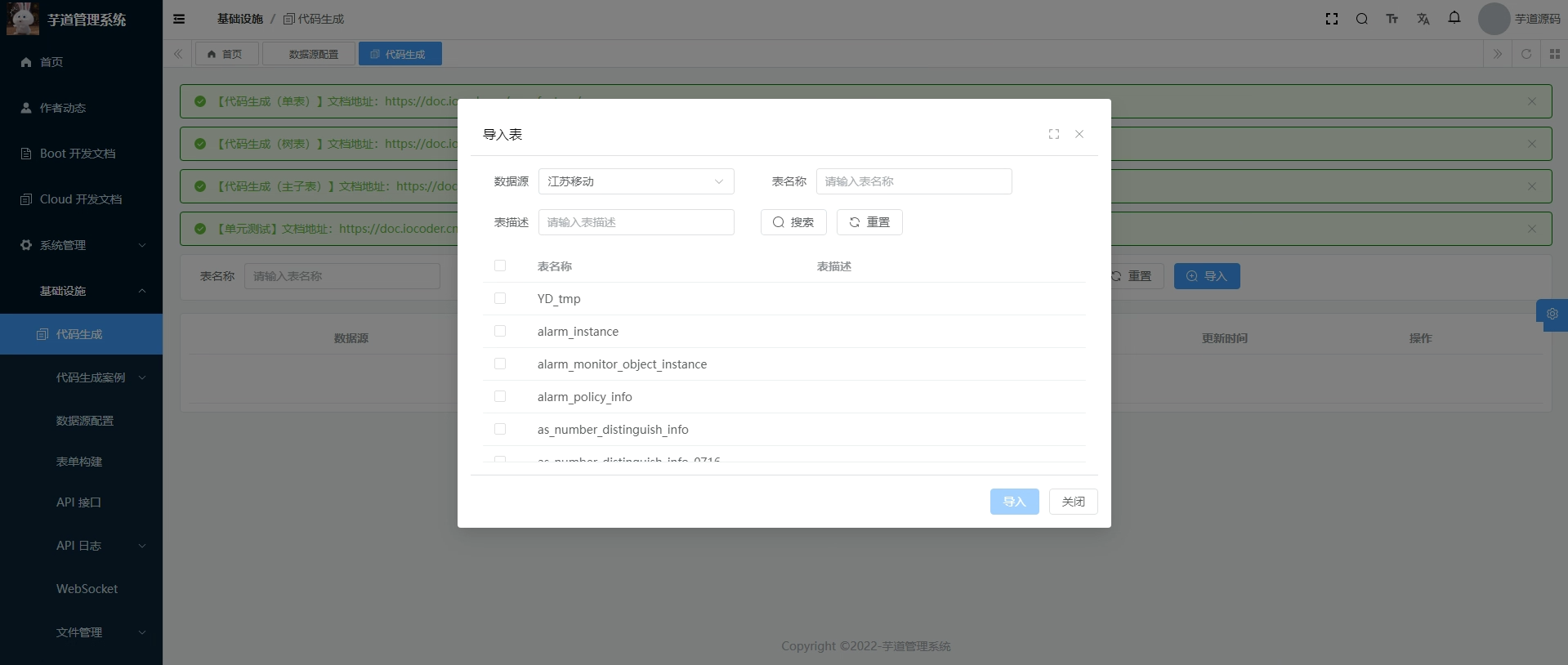 进入代码生成页面,点导入按钮,选择刚刚添加的数据源,点击搜索会展示这个数据源所有可添加的表