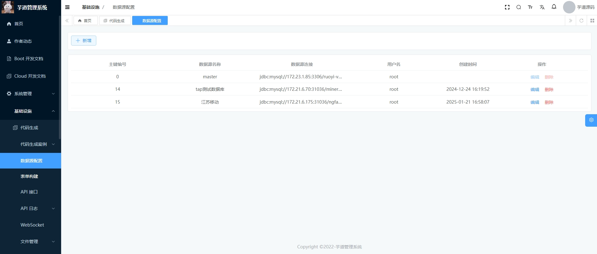 先进入页面点击数据源配置,然后点击新增,输入相关的数据源信息提交