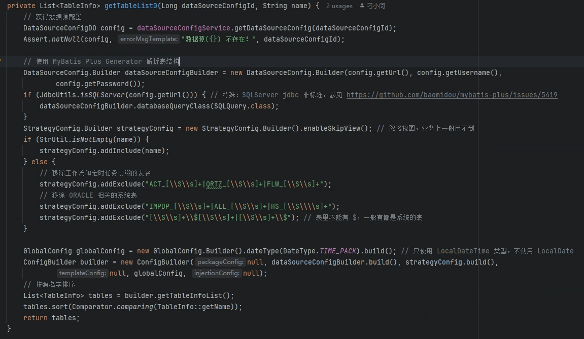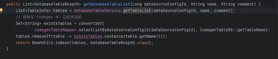 if (codegenTableMapper.selectByTableNameAndDataSourceConfigId(tableInfo.getName(),